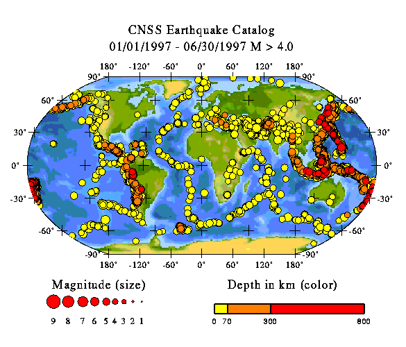 Data can be plotted on a map, such as this one from www.geo.ed.ac.uk/quakes/quakes.html.