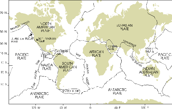 You can determine this yourself by plotting recent earthquakes on a world map. The locations of the earthquakes reveal the plate boundaries.